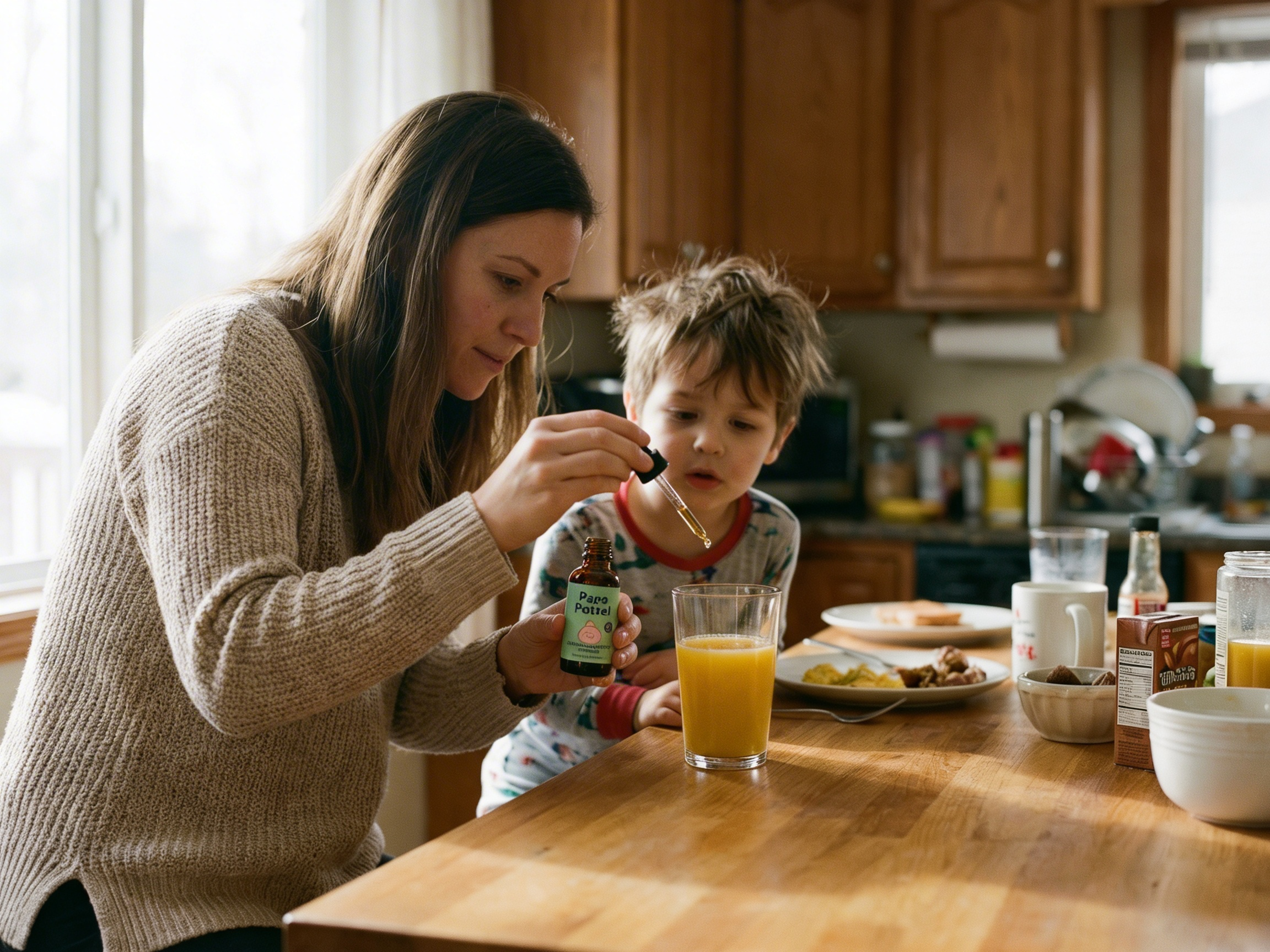 Most parents mix both droppers into a small amount of juice, smoothie, yogurt, or water. Most children don't notice them in a morning smoothie.